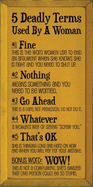Five deadly terms used by a woman. Fine - this is the word women use to end an argument when she knows she is right and you need to shut up. Nothing - means something, and you need to be worried. Go ahead - it's a dare, not a permission. Don't do it.